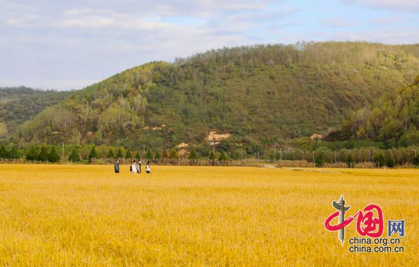 10月17日,延安南泥湾,千亩水稻即将进入收获期。图为在稻田旁观赏的游客。中国网记者 吴疆 摄
