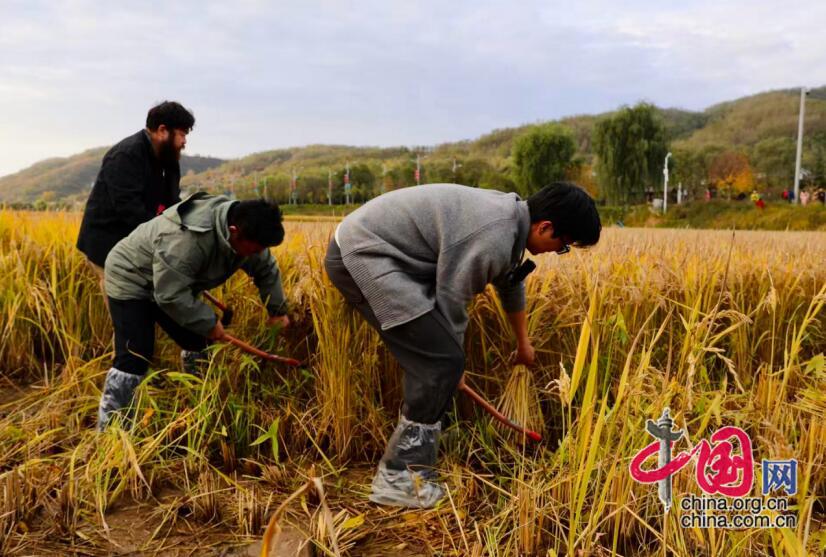 10月17日,延安南泥湾,千亩水稻即将进入收获期。图为参与“红星照耀中国:从伟大胜利走向伟大复兴”活动的自媒体达人体验收割水稻。中国网记者 吴疆 摄