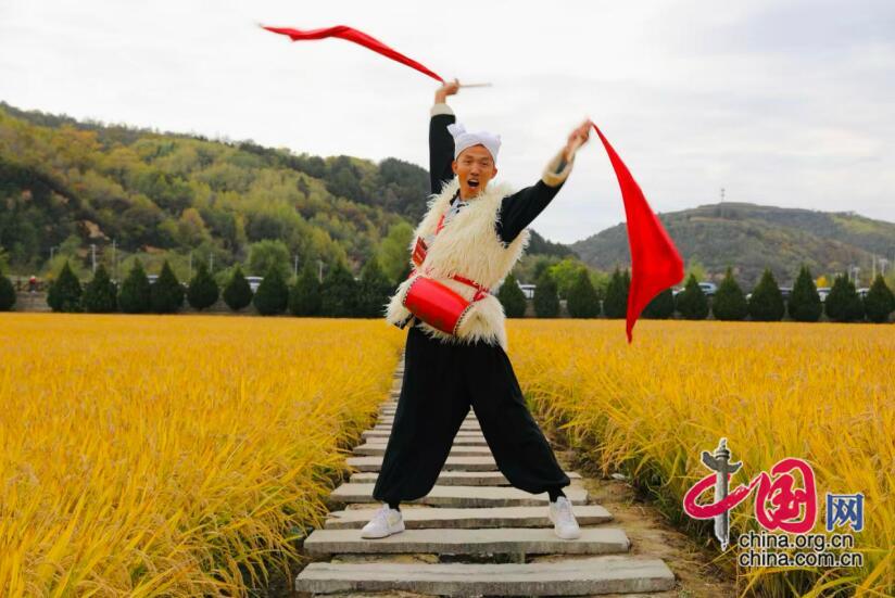 10月17日,延安南泥湾,千亩水稻即将进入收获期。图为在稻田旁表演安塞腰鼓的自媒体博主。中国网记者 吴疆 摄