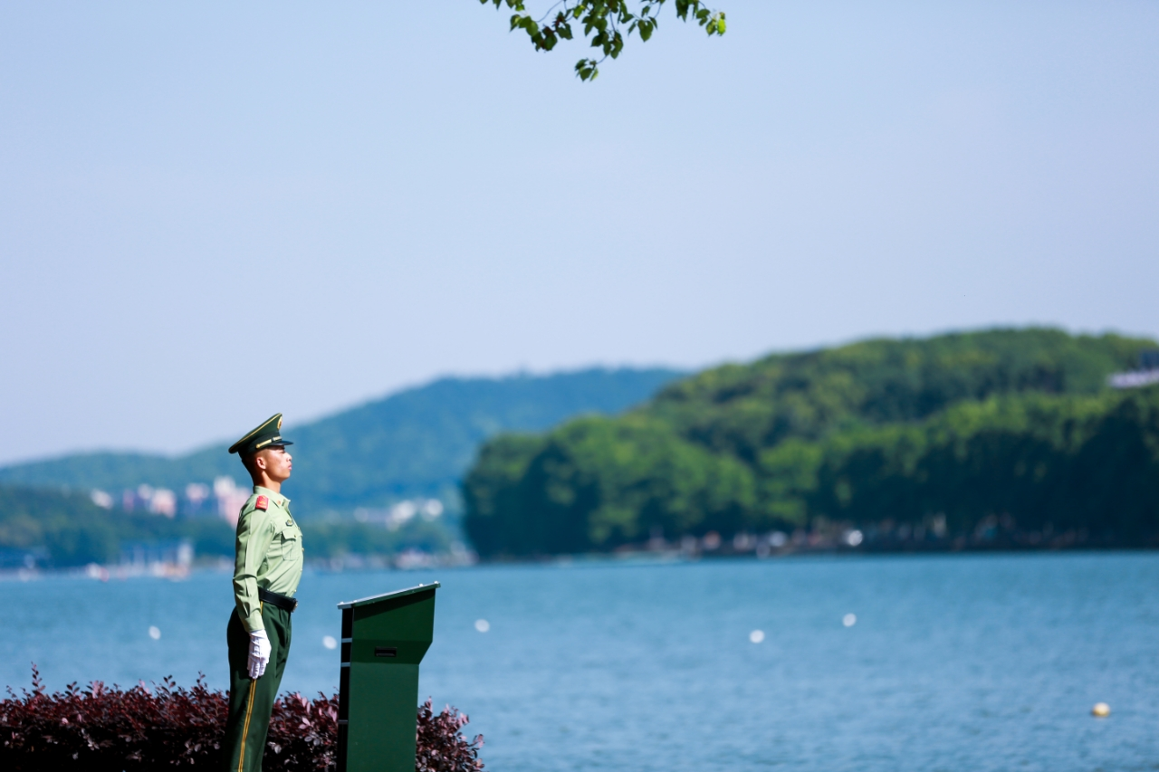 九中队战士在东湖湖畔站岗,张志伟摄