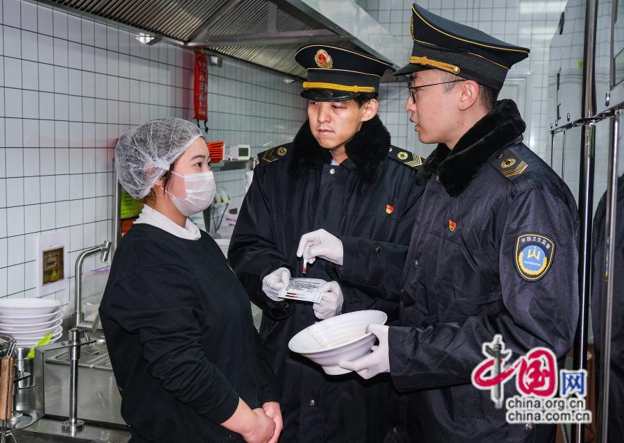 2月1日,疾控中心工作人员在天津西站快餐店对快餐食品进行监督指导检查。中国网发 杨宝森 摄