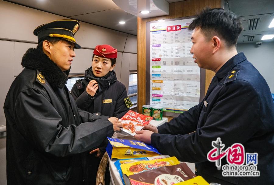 2月1日,疾控中心工作人员在高铁餐车上对配餐食品进行监督查看。中国网发 杨宝森 摄