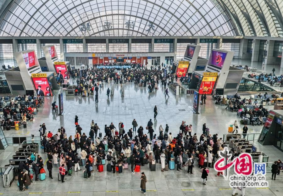 2月1日,天津西站候车大厅旅客正在有序排队等候乘车。中国网发 杨宝森 摄