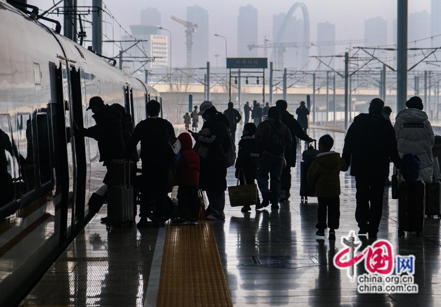 2月1日,旅客在天津西站站台上陆续乘车。中国网发 杨宝森 摄