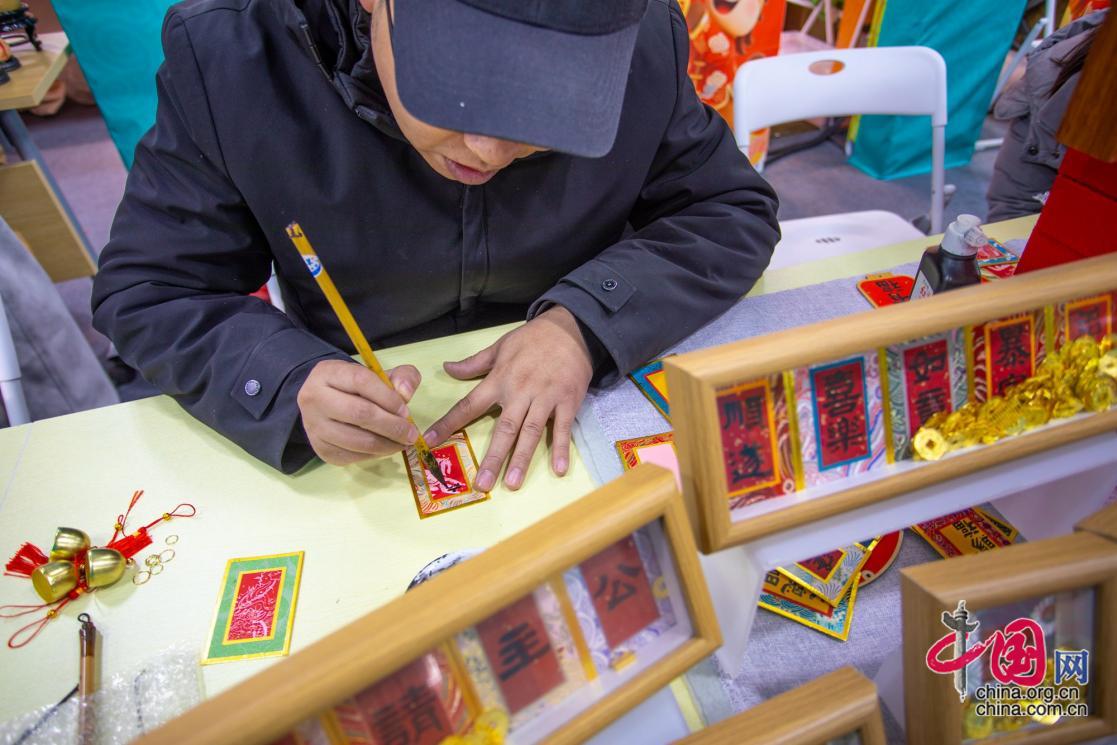 库绢非遗第四代传承人孙寅普介绍了这项百年宫廷技艺:库绢是我国传统工艺中的珍稀品类,需将加工后的绢帛托裱于纸张之上,再绘制传统纹样。库绢兼具书画艺术与工艺美感。孙寅普告诉记者:“能在非遗大集普及技艺,让大家感受传统文化的魅力,也给春节添点喜庆热闹的氛围,我觉得特别有意义。”