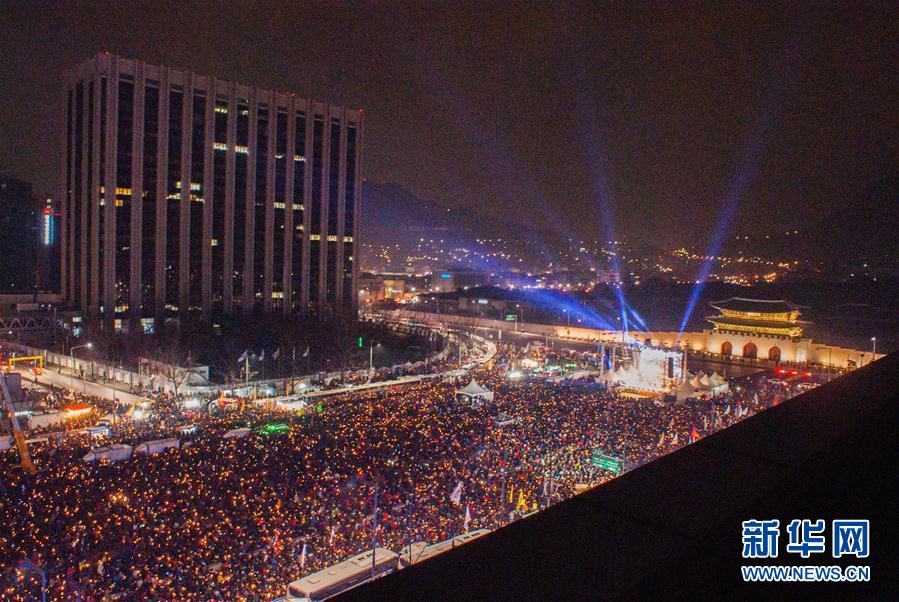 这是12月31日在韩国首尔拍摄的集会现场。当日,韩国民众在首尔光化门广场举行“送朴迎新”烛光集会,要求朴槿惠立即下台。新华社发(李相浩摄)