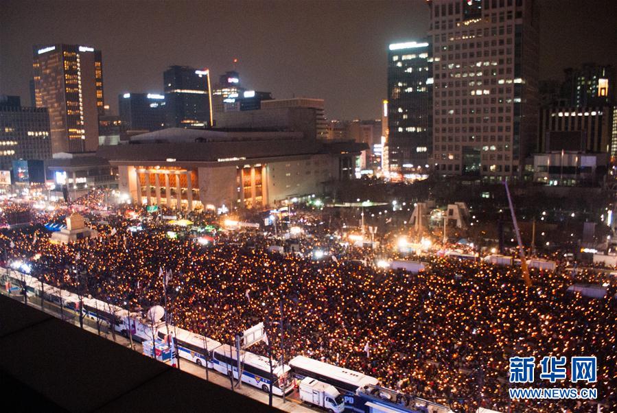 这是12月31日在韩国首尔拍摄的集会现场。当日,韩国民众在首尔光化门广场举行“送朴迎新”烛光集会,要求朴槿惠立即下台。新华社发(李相浩摄)