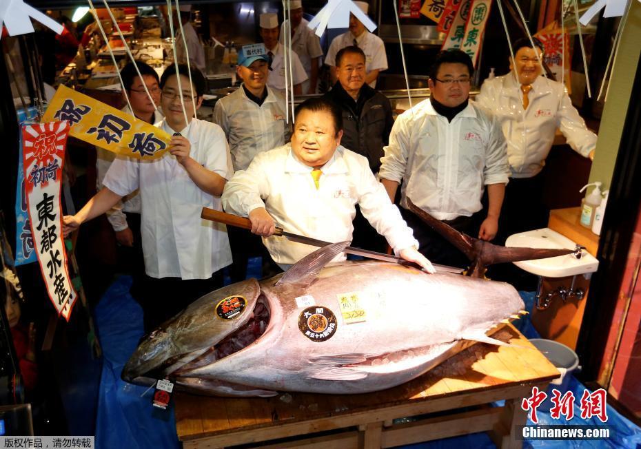 当地时间2017年1月5日,日本东京,筑地水产市场迎来了2017年的首个交易日,在开市前就有不少客人来预定这里著名的蓝鳍金枪鱼,而其中最大的一条金枪鱼被寿司连锁店“寿司三昧”的老板Kiyoshi Kimura拍得,这条重达212公斤的蓝鳍金枪鱼成交价为7400万日元(约4370000人民币)。图为“寿司三昧”老板Kiyoshi Kimura在他的门店前向顾客展示这条巨型金枪鱼。