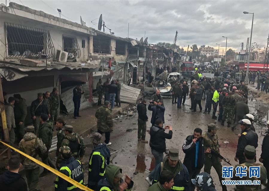1月5日,在叙利亚西北部沿海城市杰卜莱,民众与警察聚集在爆炸现场。叙利亚西北部沿海城市杰卜莱5日发生汽车炸弹袭击,造成9人死亡、15人受伤。新华社/法新