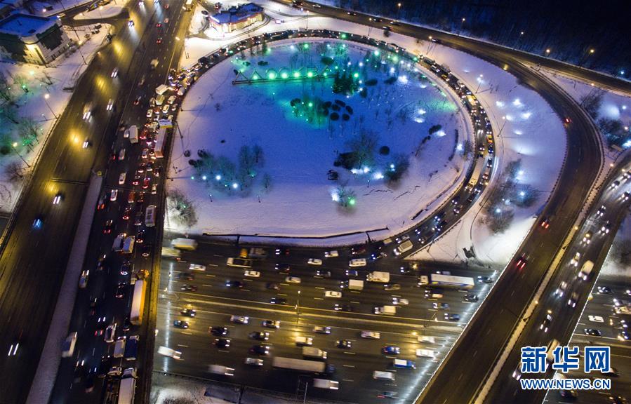 这是2016年12月27日在俄罗斯首都莫斯科拍摄的环城公路和华沙公路交叉点的立交桥夜景。