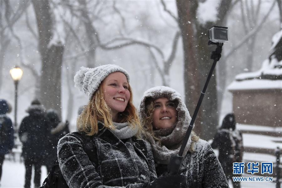 1月7日,在美国纽约,两名女子在中央公园自拍。从7日早晨开始,纽约迎来风雪天气。 新华社记者王迎摄