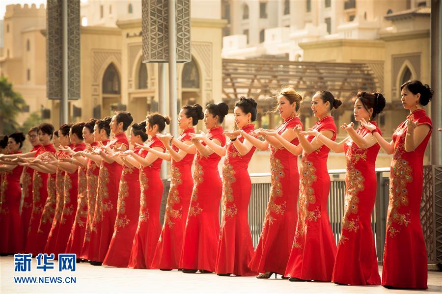1月15日,身着旗袍的快闪活动参与者在阿联酋迪拜表演。新华社发(张澍民摄)