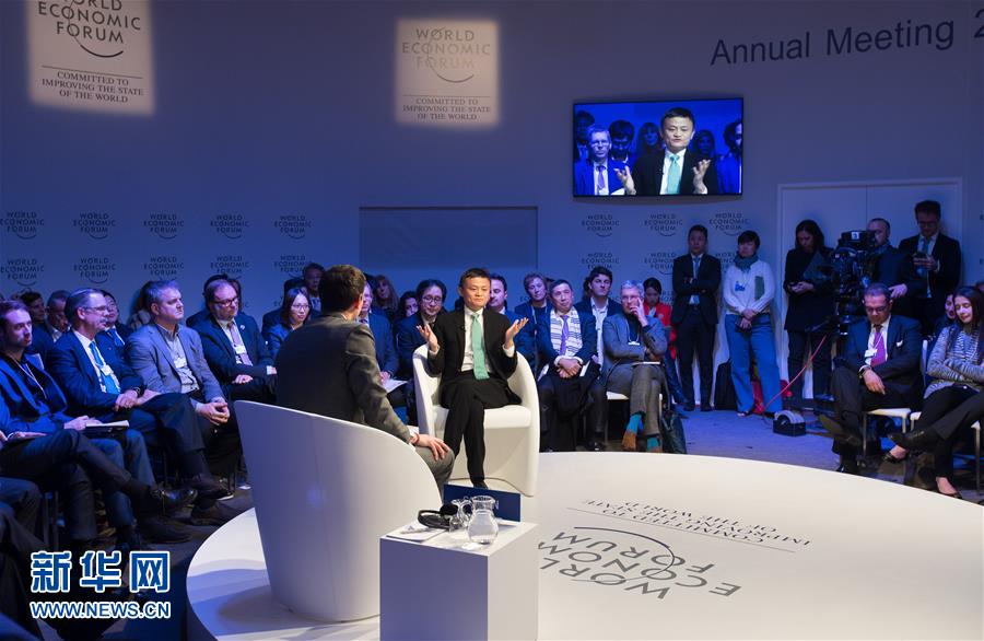 1月18日,在瑞士达沃斯,阿里巴巴集团董事局主席马云(中)出席世界经济论坛年会专题对话会。