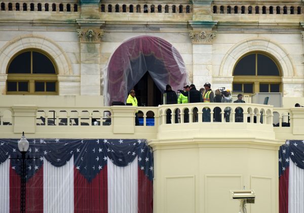 1月17日,工作人员在美国华盛顿国会大厦西侧工作,为特朗普就职典礼做准备。新华社记者 殷博古 摄