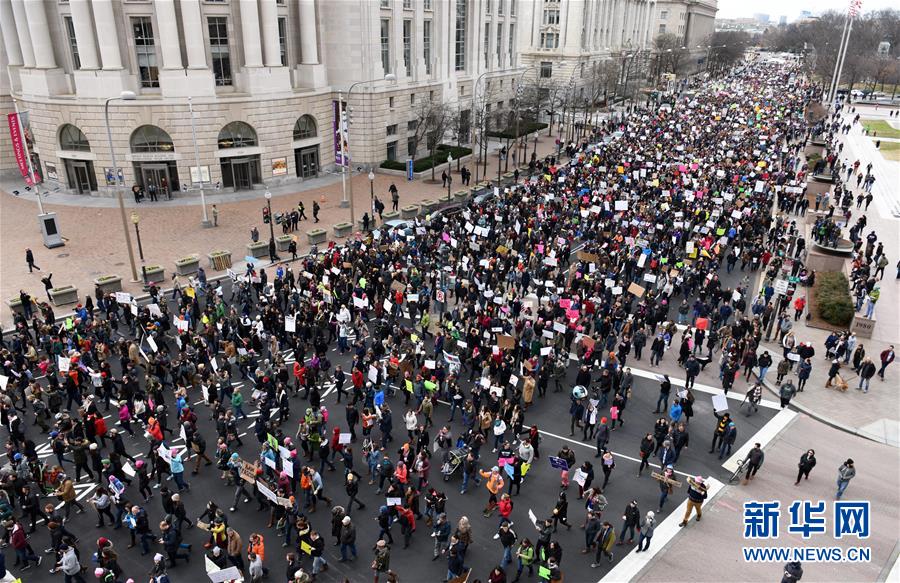 1月29日,人们在美国华盛顿参加示威游行。美国民众29日下午在华盛顿白宫附近集会,抗议美国总统特朗普日前签署的关于限制移民的行政命令。新华社记者殷博古摄
