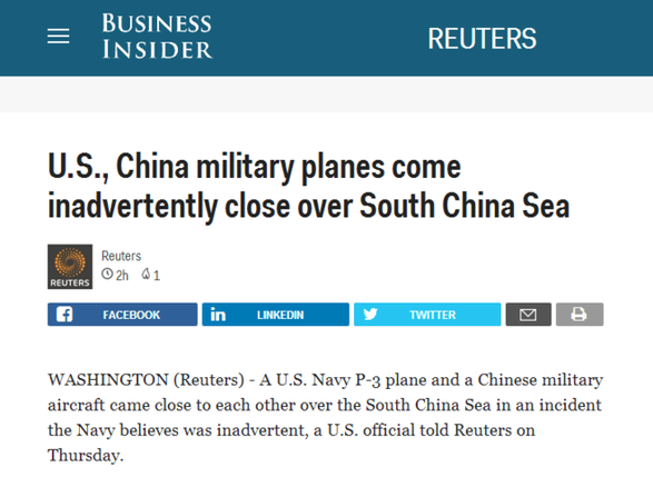 据英国路透社2月10日报道,一名美国官员9日告诉路透社称,美国海军一架P-3巡逻机和一架中国军机于2月8日在南海上空接近,美国海军认为,此事件并非故意。