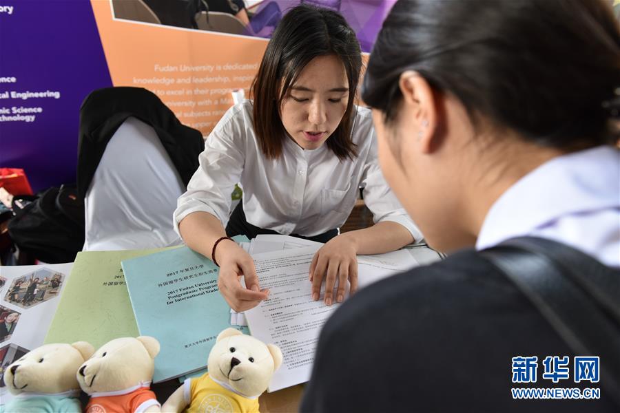 2月11日,在泰国曼谷,一名泰国中学生在复旦大学宣传展位上了解招生政策。