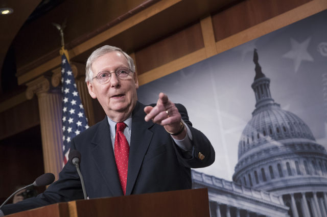2月17日,在美国华盛顿,美国国会参议院多数党领袖、共和党人麦康奈尔在记者会上表示,不支持特朗普每天发推特。(新华社/美联)