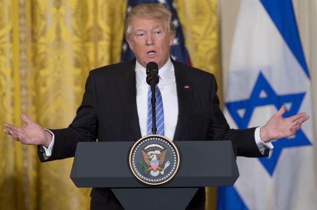 2月15日,在美国华盛顿白宫,美国总统特朗普与来访的以色列总理内塔尼亚胡(不在画面中)出席联合记者会。( 新华社/法新)