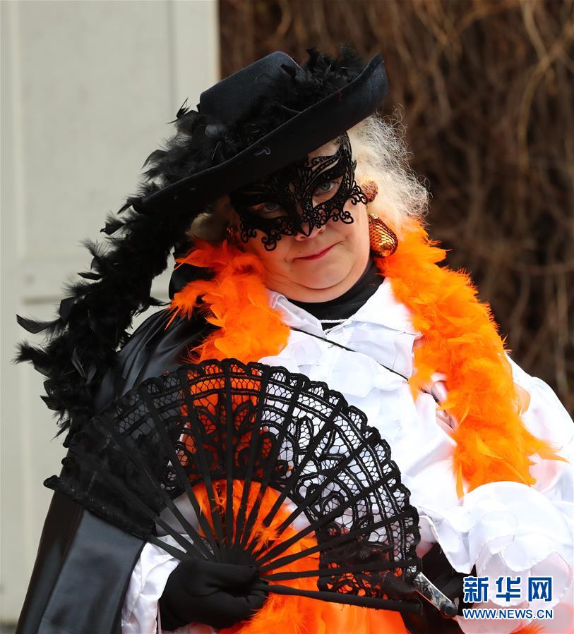 3月4日,在比利时首都布鲁塞尔,一名女子参加面具狂欢节。一场面具狂欢节4日在这里上演。这场狂欢节仿照威尼斯狂欢节的风格,表演者们身着华丽的服装,头戴各式面具,以优雅的姿态缓步行进,吸引了不少参观者。新华社记者龚兵摄