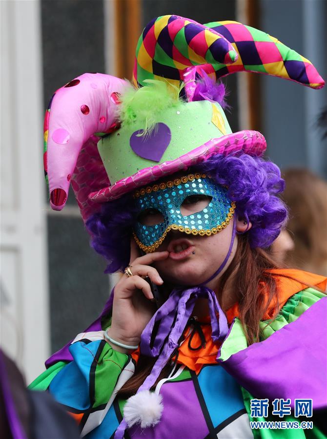 3月4日,在比利时首都布鲁塞尔,一名女子在参加面具狂欢节时打手机。一场面具狂欢节4日在这里上演。这场狂欢节仿照威尼斯狂欢节的风格,表演者们身着华丽的服装,头戴各式面具,以优雅的姿态缓步行进,吸引了不少参观者。新华社记者龚兵摄