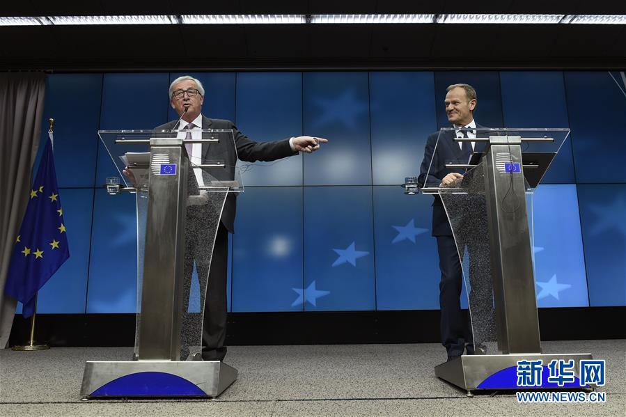 3月10日,在比利时首都布鲁塞尔,欧洲理事会主席图斯克(右)和欧盟委员会主席容克出席记者会。