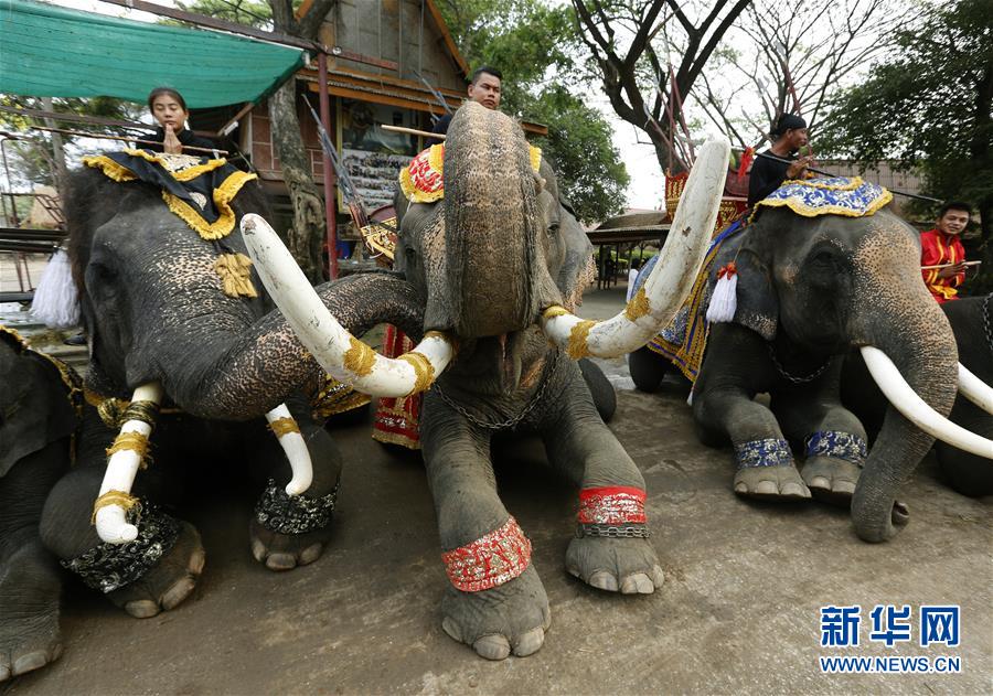 3月13日,在泰国大城,几头大象参加大象日祝福活动。当日,泰国大城举办多种活动庆祝一年一度的大象日。 新华社/欧新