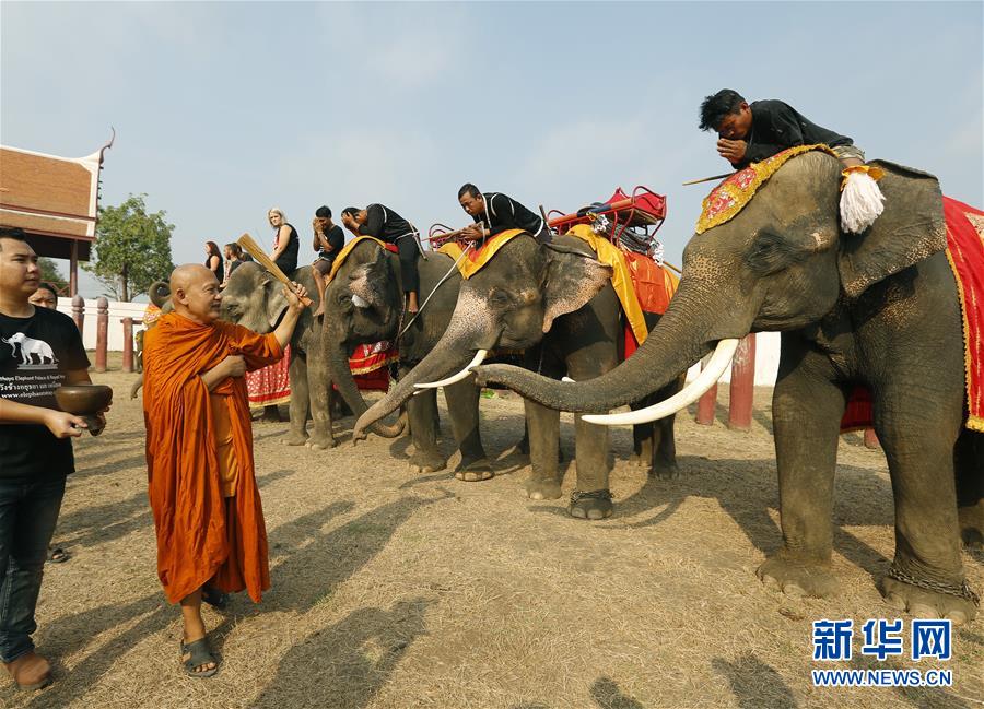 3月13日,在泰国大城,几头大象参加大象日祝福活动。当日,泰国大城举办多种活动庆祝一年一度的大象日。 新华社/欧新