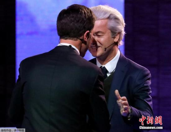 当地时间2017年3月13日,荷兰鹿特丹,荷兰大选即将举行,两名政党候选人举行全国电视辩论,现任首相马克·吕特和荷兰自由党领导人维尔德斯参加电视辩论。