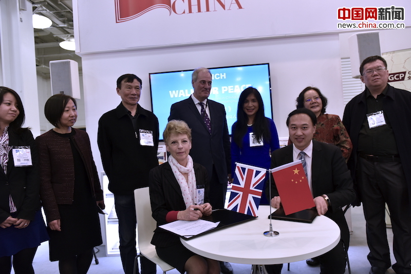 英国时间3月14日,在伦敦书展中国国际出版集团展位,新世界出版社与全球中国出版社举办《为和平徒步——中国之旅的超文化体验》版权签约仪式。摄影 王志永