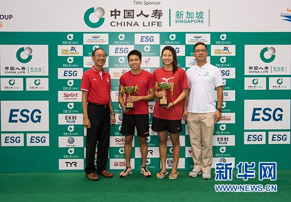 中国人寿保险(新加坡)有限公司总经理周文威 (右一)和新加坡游泳协会主席李国才(左一)为获奖选手颁奖。(新华网发 王应耀 摄)