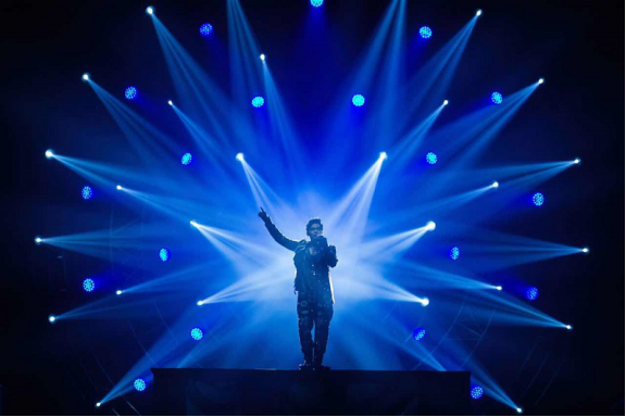 杰伦一身闪亮盔甲走出,《英雄》点燃全场。魔音娱乐供图
