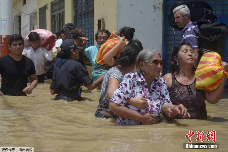 秘鲁洪水淹没街道 水深及腰民众出行艰难