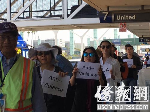 据美国《侨报》报道,当地时间15日上午10点30分左右,数十名华裔民众分别在美国洛杉矶国际机场美国联合航空公司(United Airlines,UA)航站楼以及UA航空货运部门前,进行有秩序的示威游行。在这场游行中,华裔民众只是静静地在航站楼UA公司门前举牌行走,没有大喊。