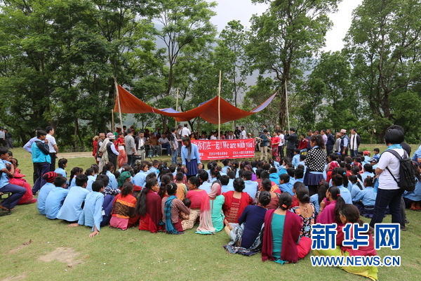 捐赠活动现场。2015年4月25日的大地震中,该校的教学楼和宿舍楼倒塌。中国政府已经答应帮他们重建,下个月正式动工。新华网发