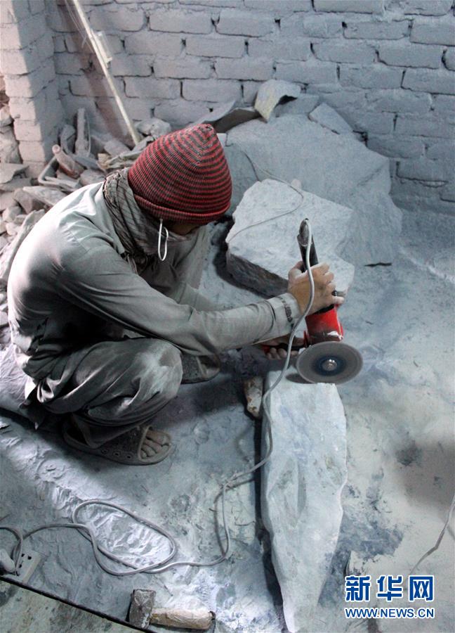 4月17日,在巴基斯坦西北部城市白沙瓦,一名工人切割青金石原石。新华社发(穆罕默德·哈迪摄)