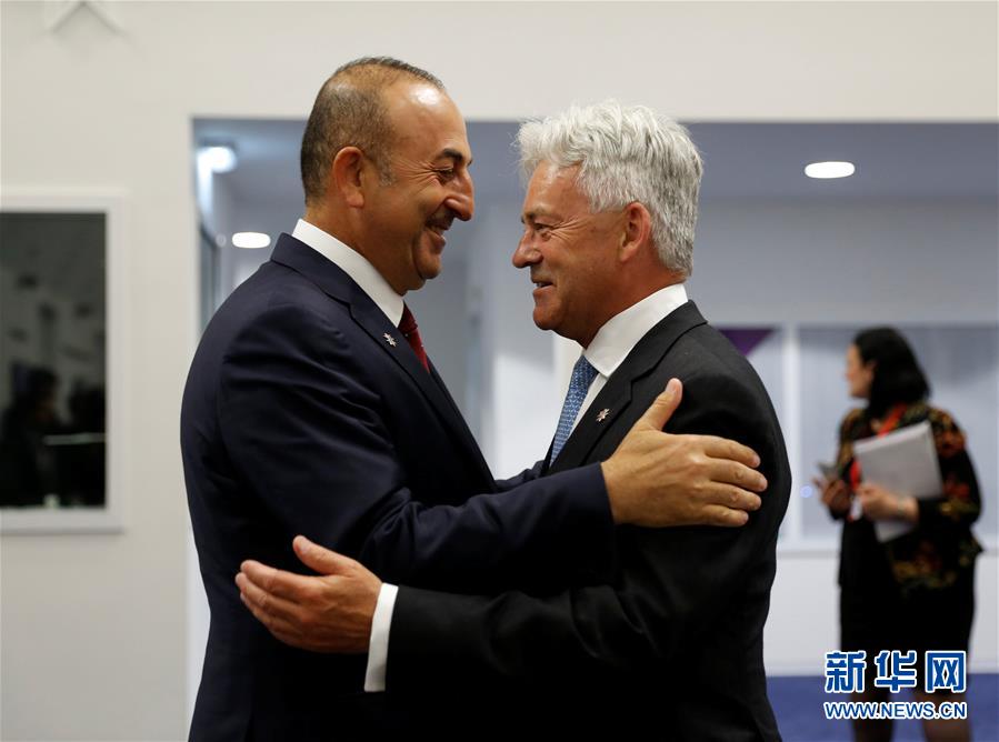 4月28日,在马耳他瓦莱塔,土耳其外长恰武什奥卢(左)参加欧盟外交部长非正式会议时与英国外交国务大臣艾伦·邓肯交谈。