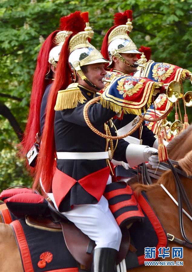 5月8日,法国共和国卫队仪仗队策马行进在巴黎香榭丽舍大街上。当日是第二次世界大战“欧洲胜利日”,法国在巴黎凯旋门举行仪式,纪念二战胜利72周年。新华社记者李根兴摄