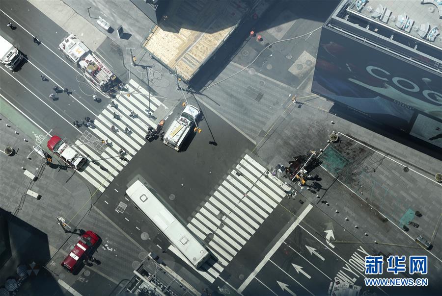 这是在美国纽约时报广场拍摄的汽车冲上人行道事件现场(5月18日摄)。一辆红色小轿车18日在美国纽约时报广场冲上人行道,消防部门说事件已造成1人死亡、22人受伤。新华社记者王迎摄