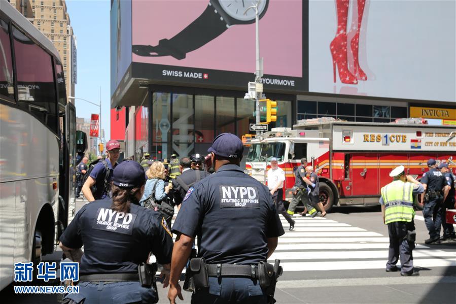 5月18日,警察在美国纽约时报广场查看现场。一辆红色小轿车18日在美国纽约时报广场冲上人行道,消防部门说事件已造成1人死亡、22人受伤。新华社记者杨士龙摄