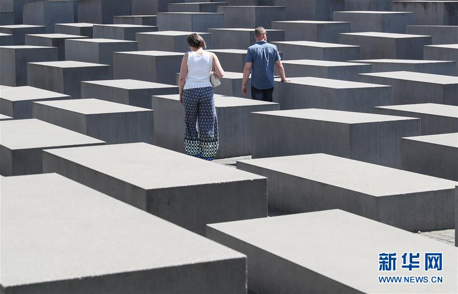 5月18日,在德国首都柏林,参观者在欧洲被害犹太人纪念碑间行走。欧洲被害犹太人纪念碑位于柏林市中心,占地1.9万平方米。纪念碑实际上是由2711块大小不一的长方体水泥碑石组成的碑林。碑林下方是一个地下档案展览馆,展示欧洲犹太人当年惨遭纳粹德国迫害和屠杀的历史资料。新华社记者单宇琦摄