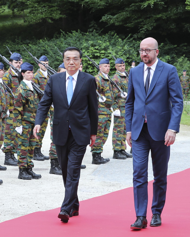 当地时间2日下午,比利时首相米歇尔在公爵夫人谷国宾馆举行仪式盛迎李克强总理到访。李克强抵达时,米歇尔在停车处迎接。两国领导人登上检阅台,军乐队先后奏响中比两国国歌。李克强随后在米歇尔陪同下检阅仪仗队。