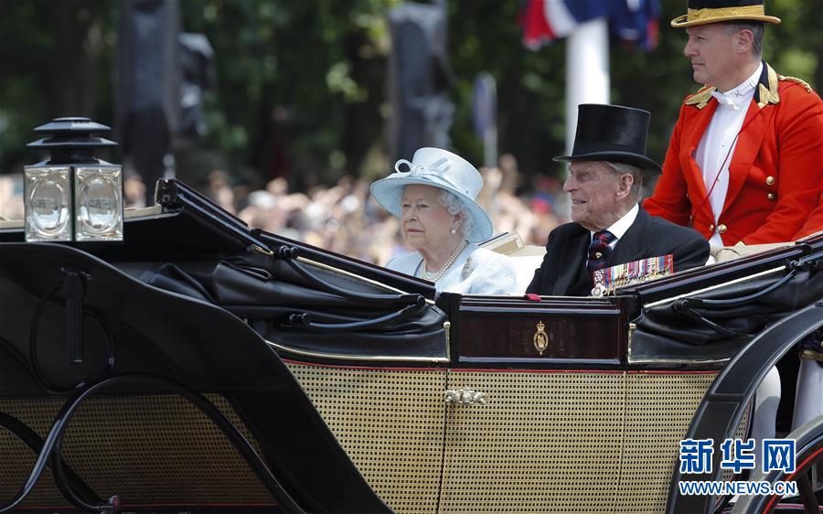6月17日,在英国伦敦,英女王伊丽莎白二世(前左)与丈夫菲利普亲王(前右)乘坐马车返回白金汉宫。当日,英国伦敦举行盛大生日庆典,庆祝英女王91岁官方生日。