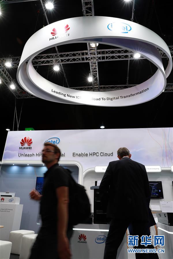 6月19日, 在德国法兰克福会展中心举行的国际超级计算大会上,来宾参观华为公司展台。