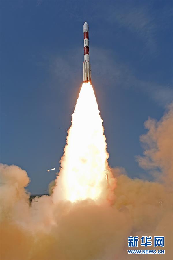 印度空间研究组织23日在印度东南部安得拉邦的萨蒂什·达万航天中心成功发射了一枚代号为“PSLV-C38”的运载火箭,把1颗地球观测卫星和30颗纳米卫星送入轨道。新华社发(印度空间研究组织供图)
