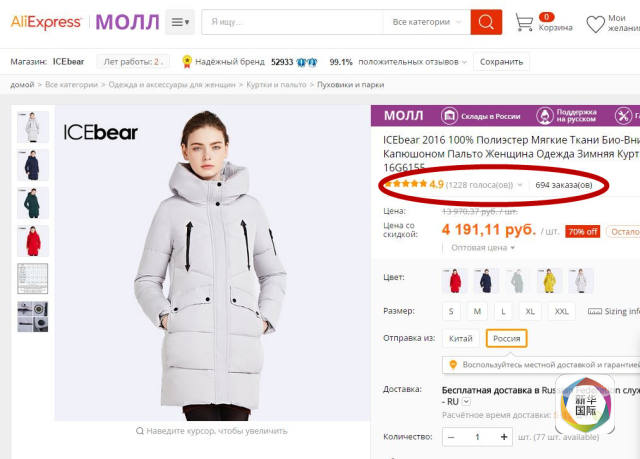 在阿里速卖通网站上,ICEbear店铺的粉丝收藏量超过37万。在一件白色女式羽绒服的销售页面上,买家留言上千条,大多点赞羽绒服质量好、送货快。