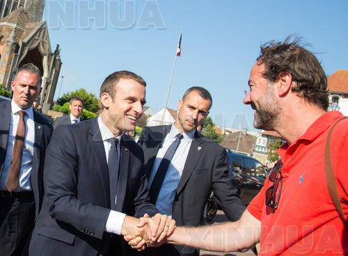 6月18日,在法国勒图凯,法国总统马克龙(前左)在投票后与支持者握手。(克里斯季娜·阿法纳西耶娃摄)