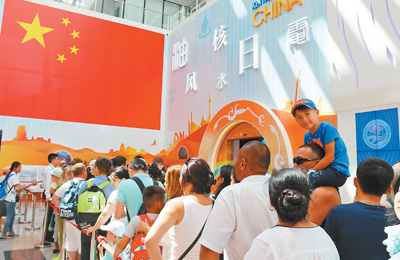 在阿斯塔纳专项世博会中国国家馆日活动现场,当地观众正在排队等候进入场馆参观。本报记者 周翰博摄