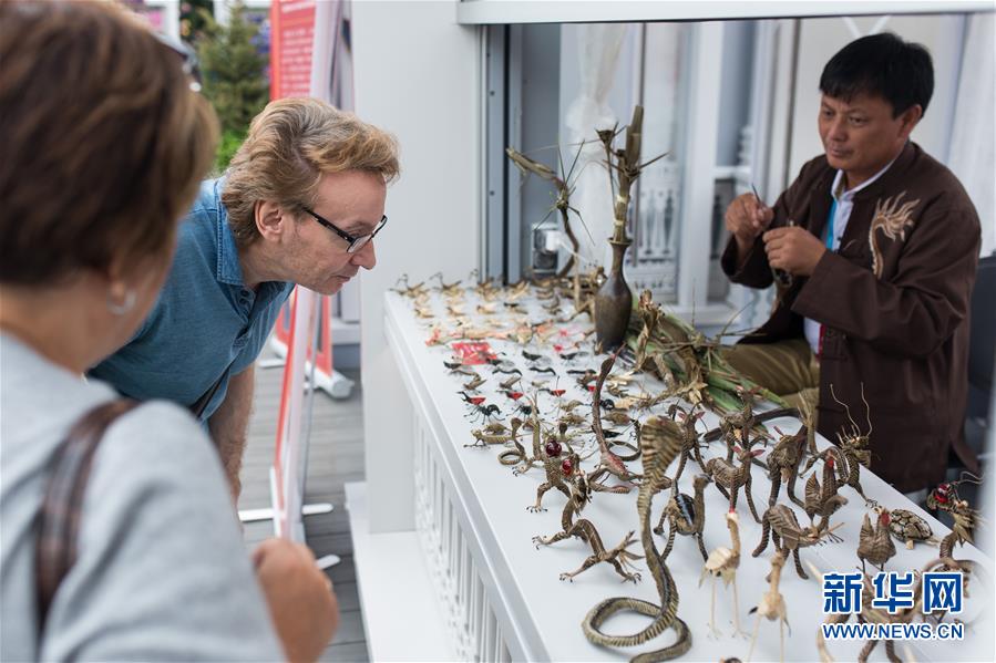 7月17日,在俄罗斯首都莫斯科革命广场,人们观看庙会上售卖的草编产品。作为北京市东城区与莫斯科中央区在国际友好城区框架下系列交流活动的重要组成部分,“地坛庙会全球行·2017莫斯科之旅”活动于15日在革命广场开幕,为期4天。期间,包括书法、绘画、剪纸、面人、雕漆、景泰蓝、泥人张等40多种中国传统文化代表项目以展台和表演的形式集体亮相,向当地民众和游客展示中国文化的独特魅力。新华社记者白雪骐 摄