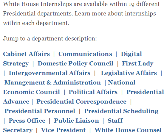目前,白宫官网登出共有19个部门可以申请实习,这些部门包括内阁事务办公室、第一夫人办公室、管理和行政办公室。其中管理和行政办公室的分支之一“白宫图片办公室”也是此次招收实习生的部门,这个部门过去没少上头条,总统的“形象”就靠它了。白宫网站上也写道,该部门的实习生日常工作包括修图、完善图片数据库等,此外还有机会拍摄白宫某些新闻发布会。